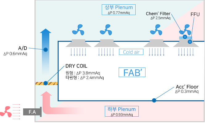 µå¶óÀÌ ÄÚÀÏDRY COILÀº °á·Î¸¦ ¹ß»ý½ÃŰÁö ¾Ê¾Æ FINÇ¥¸é¿¡ ¸ÕÁö¸¦ ÈíÂøÇÏÁö ¾ÊÀº CLEANÀåºñ¶ó ÇÒ ¼ö ÀÖÀ¸¸ç, ÇöÀç±îÁöÀÇ ±â¼ú·Î °¡Àå È¿À²ÀûÀÎ SYSTEMÀ̶ó ÇÒ ¼ö ÀÖ´Ù. 1) Á¦Ç°Æ¯Â¡ È¿À²ÀûÀÎ DRY COIL SYSTEM¡¤ DRY COILÀº °á·Î¸¦ ¹ß»ý½ÃŰÁö ¾Ê¾Æ FIN Ç¥¸é¿¡ ¸ÕÁö¸¦ ÈíÂøÇÏÁö ¾Ê´Â CLEAN Àåºñ¶ó ÇÒ ¼ö ÀÖÀ¸¸ç, ÇöÀç±îÁöÀÇ ±â¼ú·Î °¡Àå È¿À²ÀûÀÎ SYSTEMÀ̶ó ÇÒ ¼ö ÀÖ´Ù. DRY COIL°ú´Â ´Þ¸® Àü¿±³È¯À» ÅëÇØ °á·Î¸¦ ¹ß»ýÇÏ´Â WET(½ÀÄÚÀÏ)Àº ÀϹÝÀûÀÎ °øÁ¶Àåºñ¿¡¼ »ç¿ëµÇ´Â ³Ã°¢ COIL À̶ó ÇÒ ¼ö ÀÖ´Ù. DRY COIL SYSTEM¡¤ ¹ÝµµÃ¼ °øÀå¿¡ ÀÖ¾î¼ ±× FAB ³»ºÎ¿¡¼ ¿ä±¸ÇÏ´Â ¿Â¡¤½ÀµµÁ¶°ÇÀº ±× »ý»ê Á¦Ç°ÀÇ Á¤¹Ðµµ¿Í ºñ·ÊÇÏ¿© ±ØÈ÷ ³ôÀº ¼öÁØÀÇ Á¤¹ÐÁ¦¾î°¡ ¿ä±¸ µÇ¾îÁø´Ù.FAB¿¡ °ø±ÞµÇ¾îÁö´Â °ø±â´Â FABÀ¸·Î ºÎÅÍÀÇ Return Air¿Í Out Air·Î ºÎÅÍ °ø±ÞµÇ¾îÁö´Â ½Å¼± °ø±â¸¦ Mixing ÇÏ¿© Dry Cooling CoilÀº Chilled Water¿Í SupplyÃøÀÇ 2-Way Control V/V¸¦ ÀÌ¿ëÇÏ¿© FABÀÌ ¿ä±¸ÇÏ´Â ½Ç³» ¿ÂµµÁ¶°ÇÀ» Áö¼ÓÀûÀ¸·Î À¯Áö, °ø±ÞÇØÁÖ´Â ¿±³È¯ ÀåÄ¡ÀÌ´Ù.